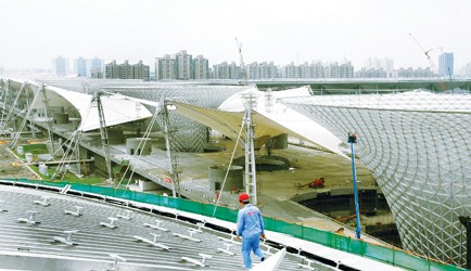 安裝在“陽光谷”頂部的索膜結構由69塊巨大的白色膜布拼裝組成,形如藍天下的朵朵